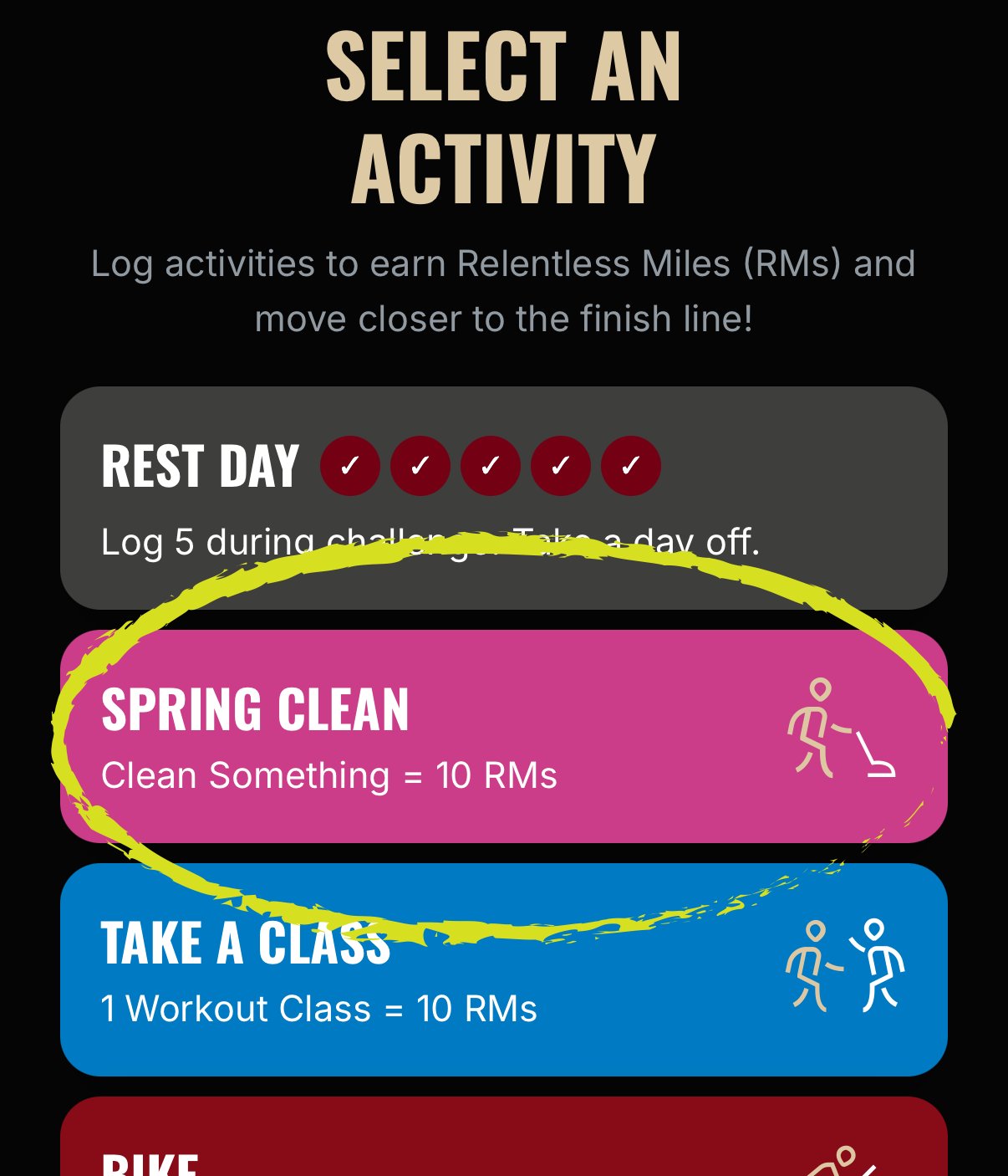 No, seriously, you need to log your rest days, PRONTO. To get that sweet, coveted big green bar on the progress tab (which means you completed this challenge), you’re gonna need all your Rest Days logged. We’ve only got 15 days left, so as Morgan Freeman always says: “Get busy resting, or get busy not finishing this challenge.”